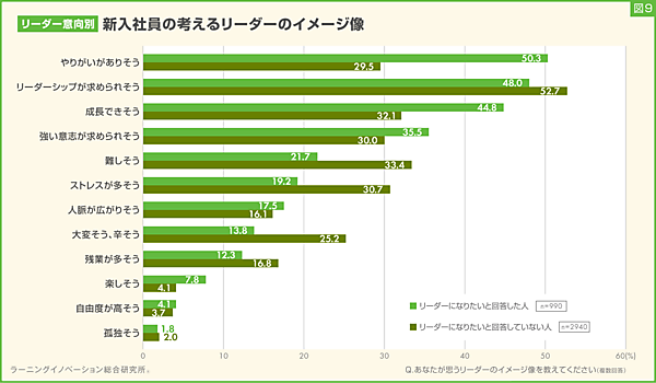 なおこれを「管理職=リーダーになりたいと回答した人」「それ以外=リーダーになりたいと回答していない人」とみなしてそれぞれで再集計すると、「リーダーになりたいと回答した人」のイメージは「やりがいがありそう」50.3%。「リーダーシップが求められそう」48.0%、「成長できそう」44.8%となったが、「リーダーになりたいと回答していない人」は、「リーダーシップが求められそう」52.7%、「難しそう」33.4%、「成長できそう」32.1%とやはり傾向差が見られた。