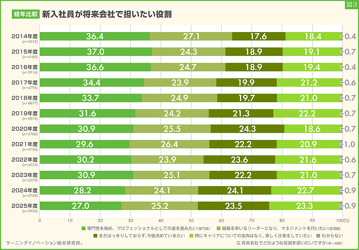 また2014年度~2025年度の回答結果を比較すると、「特にキャリアについての志向はなく、楽しく仕事をしていたい」は18.4%→23.3%まで上昇しており過去最高となった。一方「専門家」は、36.4%→27.0%まで低下しこちらは過去最低となっている。