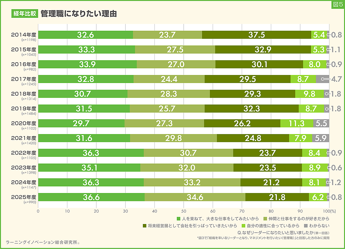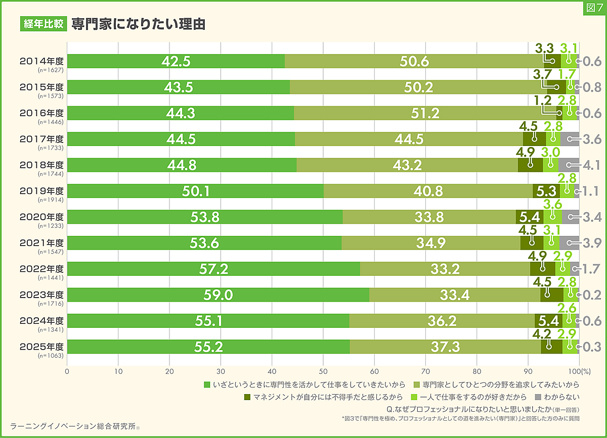 2014年度~2025年度での経年変化を見ると、管理職では「仲間と仕事をするのが好きだから」が増加傾向。「将来経営層として会社を引っぱっていきたいから」は大きく減少している。専門家については「専門家として1つの分野を追究してみたいから」が微減、「いざというときに専門性を活かして仕事をしていきたいから」が微増していたが近年は落ち着いている。