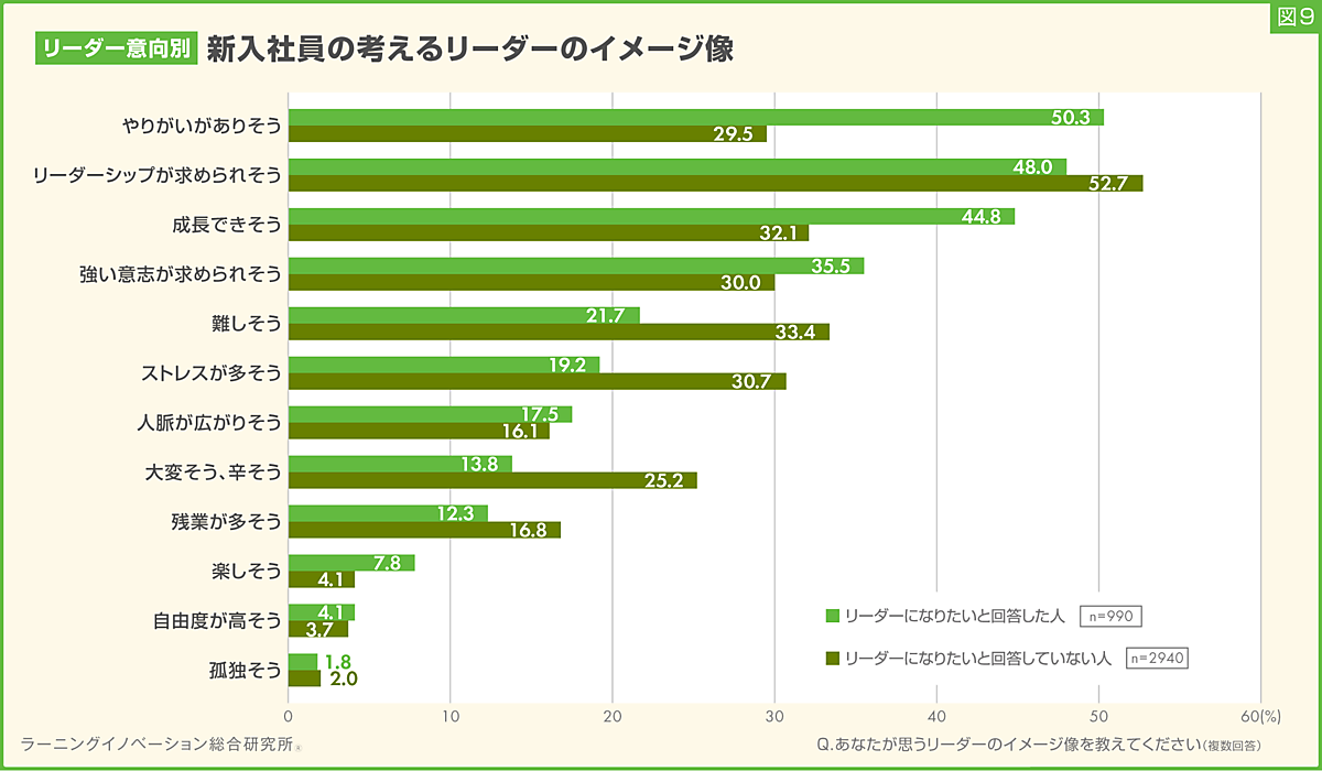 「リーダーに対するイメージ」を聞くと、「リーダーシップが求められそう」51.5%が特に多く、「成長できそう」35.3%、「やりがいがありそう」34.7%がそれに続く。