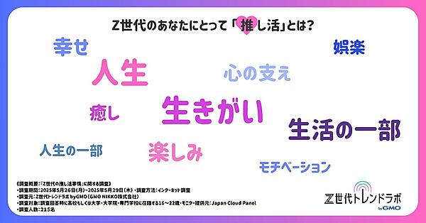 また、「“推し活”を一言で表してください」という質問では、「生きがい」と答えた人が最多に。以下「人生」「生活の一部」といった言葉が上位に並んでおり、趣味を超えた“心の支え”として捉えている人も多いことがわかった。