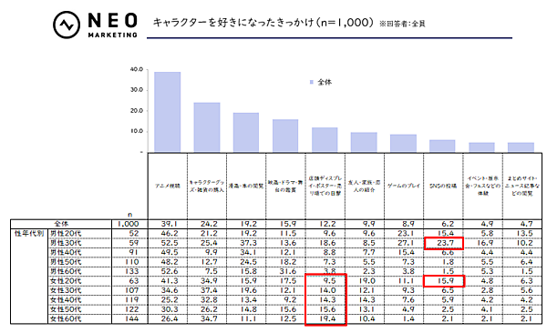 前項で回答したキャラクターを好きになったきっかけを聞くと、全体では「アニメ視聴」が39.1%で最も多く、ついで「グッズの購入」「漫画・本の閲覧」と続いた。また、「SNSの投稿」は全体では6.2%にとどまるものの、男性30代が23.7%、女性20代が15.9%と突出していた。タイムラインに流れてきた投稿やイラストが興味をもつきっかけになることも多いようだ。