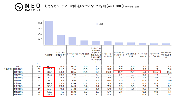 続いて、好きなキャラクターに関連しておこなった行動を聞くと、全体では「グッズを買う」が43.5%でトップに。特に女性は全ての年代で、男性を10ポイント以上上回っていた。一方で、30代男性では「オリジナルグッズ・創作物を作る」など、クリエイティブな活動をする層が一定数存在していた。