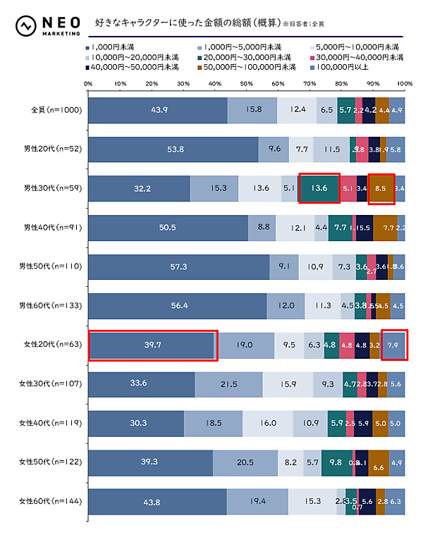好きなキャラクターに使った金額の総額としては、全体では「1,000円未満」が43.9%で最多となり、いわゆる“ライト層”が多いことがわかった。一方で、女性20代では「100,000円以上」が7.9%にのぼり、全属性でトップに。グッズを買って聖地巡礼をするなど、“体験込み”の消費を楽しんでいることがうかがえた。