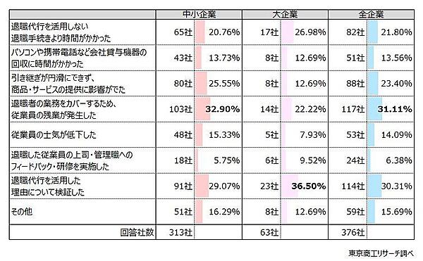 「退職代行を利用した従業員の退職による業務への影響」を聞くと、一般的に想定される「退職者の業務をカバーするため、従業員の残業が発生した」31.11%(376社中、117社)が最多だが、「退職代行を活用した理由について検証した」30.31%(114社)、「引き継ぎが円滑にできず、商品・サービスの提供に影響がでた」23.40%(88社)、「退職代行を活用しない退職手続きより時間がかかった」21.80%(82社)、「従業員の士気が低下した」14.09%(53社)、「パソコンや携帯電話など会社貸与機器の回収に時間がかかった」13.56%(51社)など、退職代行ならではのトラブルも発生しているようだ。
