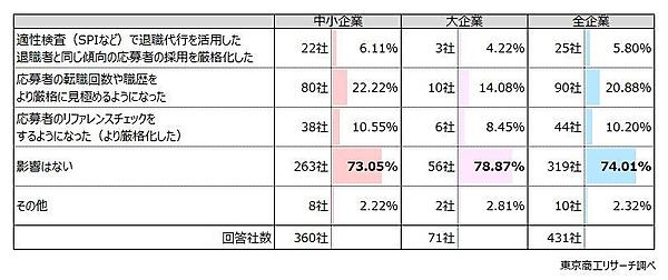 その後の採用に与えた影響としては、全企業で「影響はない」74.0%(431社中、319社)が最多だったが、「応募者の転職回数や職歴をより厳格に見極めるようになった」20.88%(90社)、「応募者のリファレンスチェックをするようになった(より厳格化した)」10.20%(44社)、「適性検査(SPIなど)で退職代行を活用した退職者と同じ傾向の応募者の採用を厳格化した」5.80%(25社)が上位となっている。