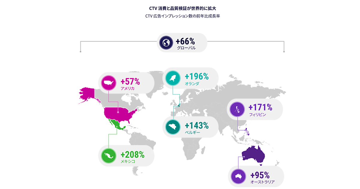 調査によると、コネクテッドTV(CTV)広告のインプレッション数は世界全体で前年比66ポイント増加した。特にメキシコ、オランダ、フィリピン、ベルギーなどの市場で目覚ましい伸びを見せており、今後も世界的に急成長を続けると予測される。