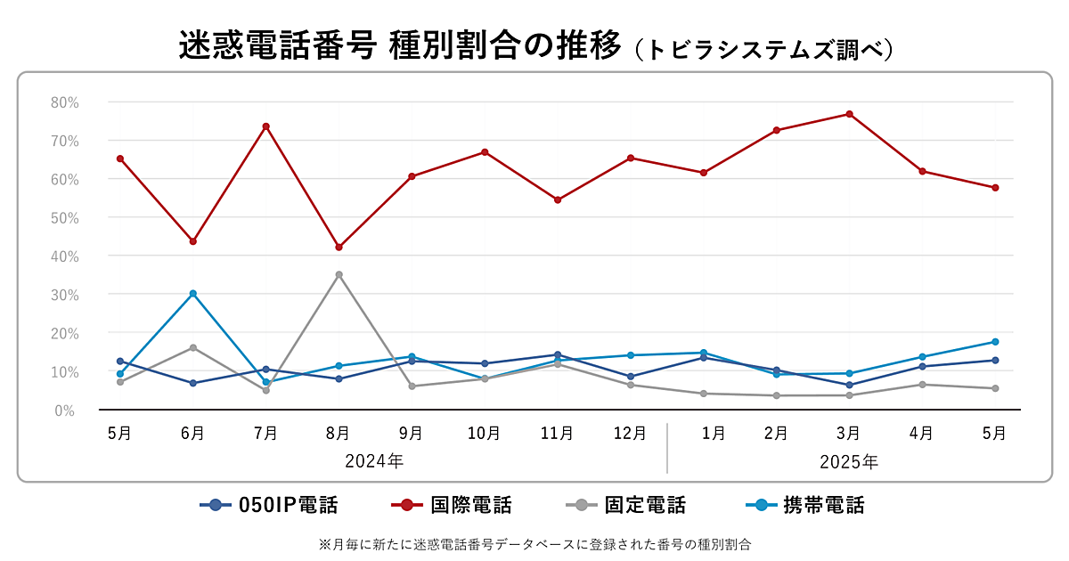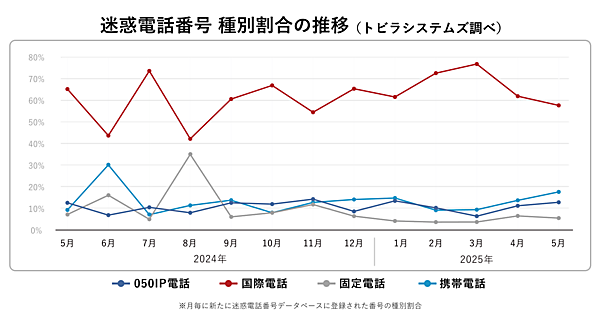 トビラシステムズの迷惑電話番号データベースに登録された番号について、国際電話番号が57.7%(前月比-4.4%)で減少した一方、携帯電話番号が増加傾向にあり、2025年5月は17.7%(前月比+3.8%)となった。