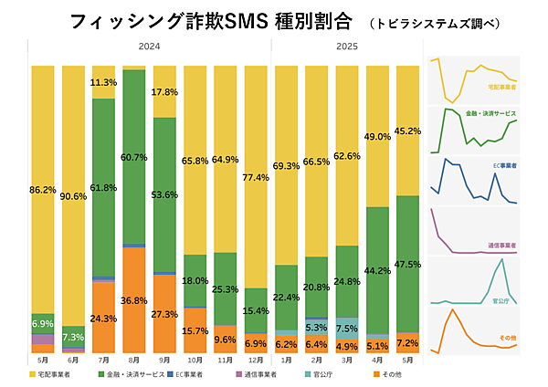フィッシング詐欺のSMSの種別では、「宅配事業者」をかたる手口が45.2%と減少傾向を見せており、「金融・決済サービス」をかたるものが47.5%で上回った。