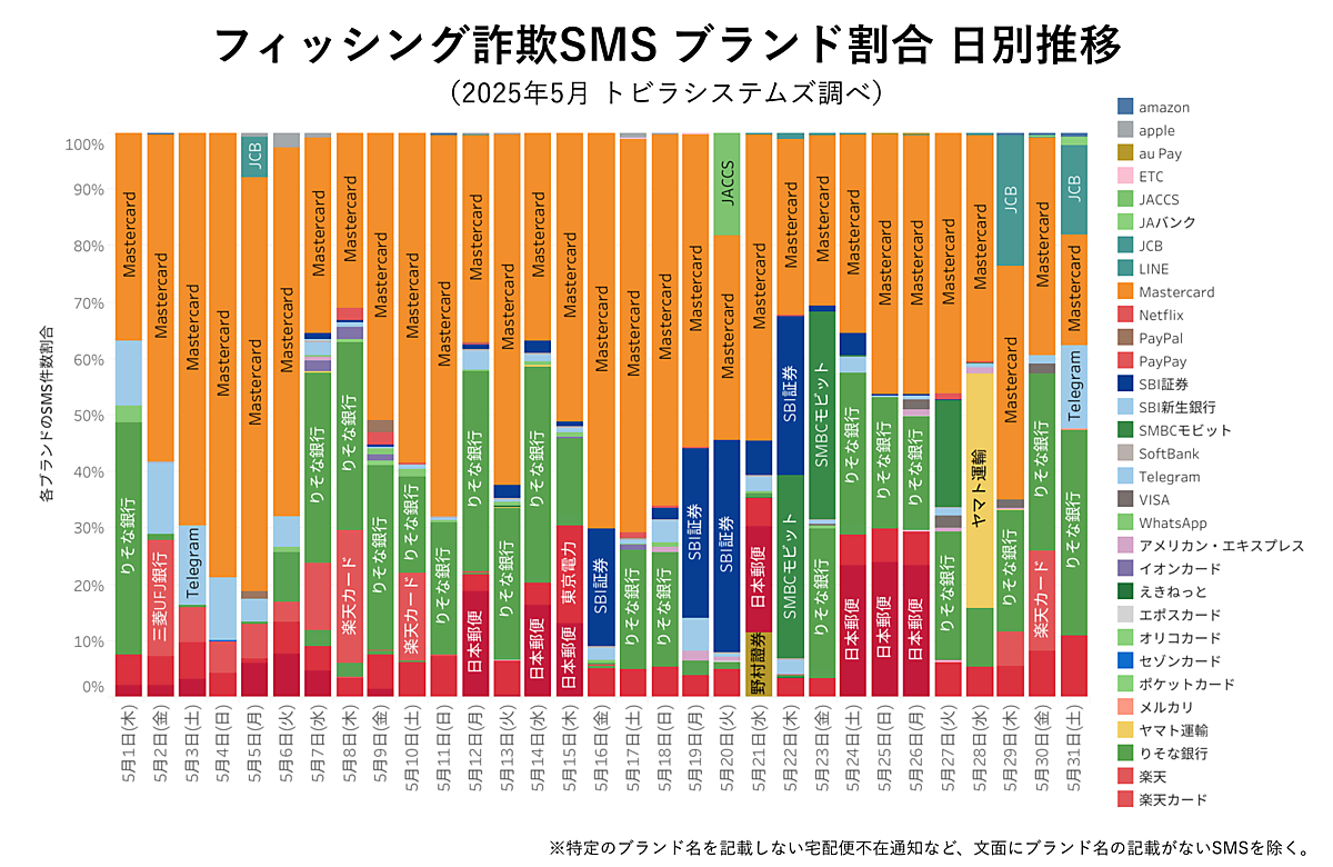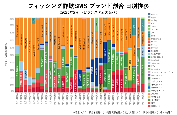 ブランド別の割合では、「Mastercard」「JCB」「JACCS」などのクレジットカードブランドをかたるSMSが発生。5月中旬には、「SBI証券」「野村證券」などの証券会社をかたる詐欺が多発した。