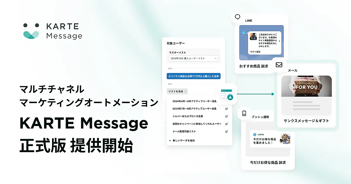 CX(顧客体験)プラットフォーム事業のプレイドは、メール、プッシュ通知、コミュニケーションアプリ「LINE」などウェブサイト外のコミュニケーションのためのマルチチャネルマーケティングオートメーション「KARTE Message」の正式版の提供を始めた、と7月9日発表した。同社の同プラットフォーム「KARTE」シリーズの1つ。β版を経て正式版を展開する。