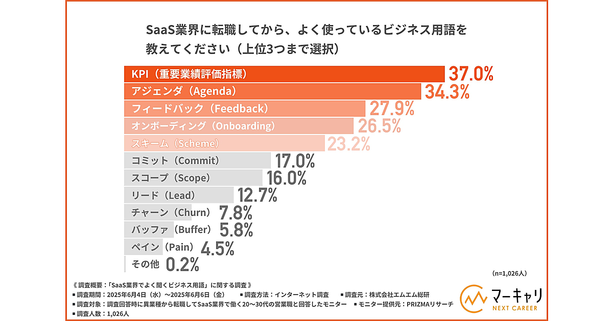 エムエム総研が、SaaS業界のビジネス用語に関する調査結果を発表した。異業種から転職してSaaS業界で働く20~30代の営業職1,026人が回答している。