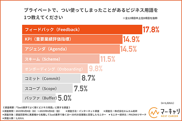 また業務で使用される用語が、プライベートな場面でも使われるケースが増えていることが明らかになった。「プライベートでつい使ってしまったことがあるビジネス用語」のランキングでは、「フィードバック」(17.8%)が1位で、「KPI」(14.9%)、「アジェンダ」(14.5%)が続いた。