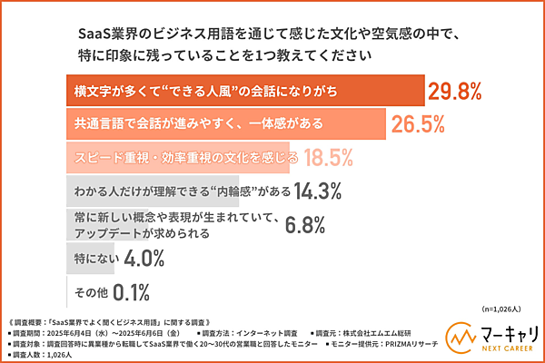SaaS業界のビジネス用語を通じて感じる文化や空気感について尋ねたところ、「横文字が多くて“できる人風”の会話になりがち」(29.8%)が最も多かった。次いで「共通言語で会話が進みやすく、一体感がある」(26.5%)、「スピード重視・効率重視の文化を感じる」(18.5%)といった回答が続いた。