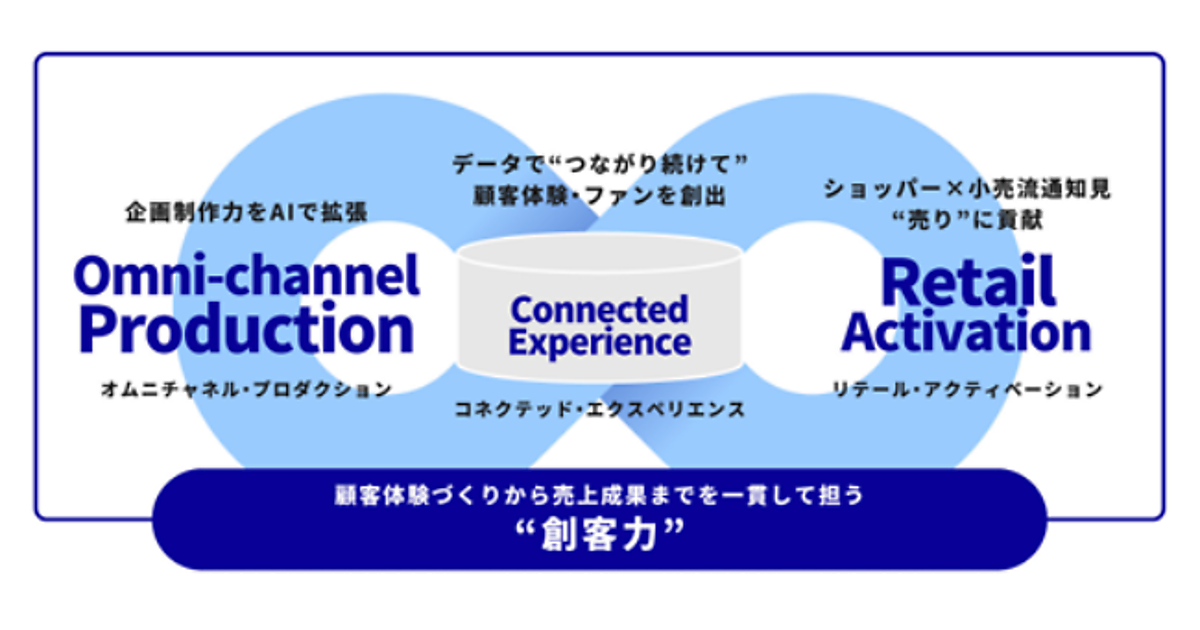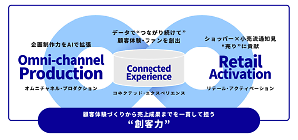 オムニチャネルプロダクションは顧客と商品・サービスの接点を統合して一貫性のある顧客体験を提供する戦略、リテールアクティベーションは小売店での販促活動全般。データを活用して顧客との接点を深め、これらの成果を高めるコネクテッドエクスペリエンス(複数のサービスの横断で一貫した顧客体験を提供する概念)を通じて新たな顧客体験やファン創出を図る。