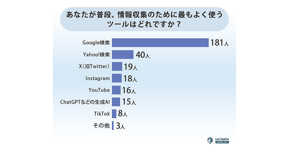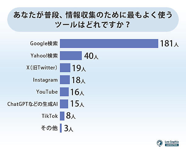 まず選択式で「普段の情報収集で最も使うツール」を聞くと、「Google検索」60.3%(181人)が圧倒的多数ながら、「Yahoo!検索」「X(旧Twitter)」「Instagram」「YouTube」「ChatGPTなどの生成AI」「TikTok」「その他」などが少数ながら定着している様子もうかがえた。