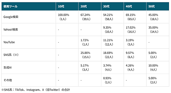 年代別で見ると、20代はX(旧Twitter)・TikTok・Instagramといった「SNS系ツール」が強く、50代では「Yahoo!検索」が強い一方で「生成AI」も10.00%と、20代の5.17%の倍近い。