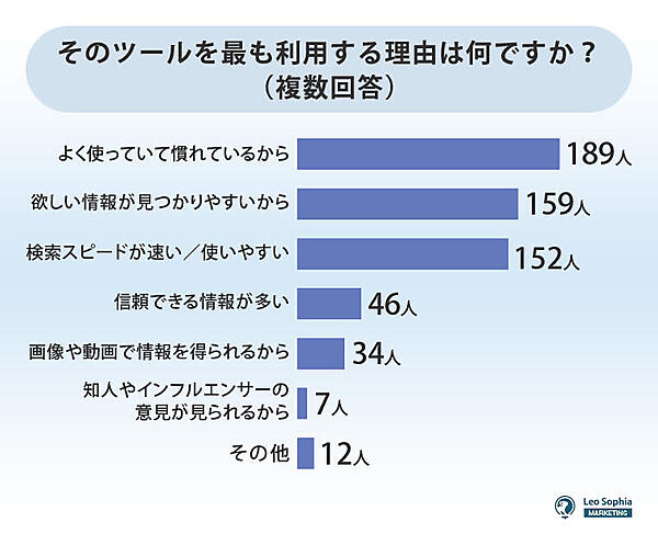 ただし「そのツールを利用する理由は何ですか?」と聞くと、「よく使っていて慣れているから」63.0%(189人)が最多ながら、「欲しい情報が見つかりやすいから」「検索スピードが速い/使いやすい」がそれに続いており、習慣だけでなく機能面も重視されている。