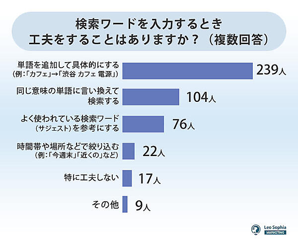 「検索ワード入力するときに工夫すること」では、「単語を追加して具体的にする」79.7%(239人)が多く、地域や時間帯、あるいは製品名などを加えて絞り込む手法が一般にも浸透している。以下「同じ意味の単語に言い換えて検索する」「よく使われている検索ワード(サジェスト)を参考にする」なども上位だ。