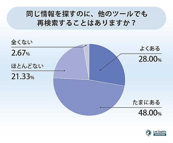 「同じ情報を探すのに、他のツールでも再検索することはありますか?」と聞くと、「よくある」28.0%、「たまにある」48.0%で、計76%のユーザーが同じ情報を求めて異なるプラットフォームで再検索を行っていた。