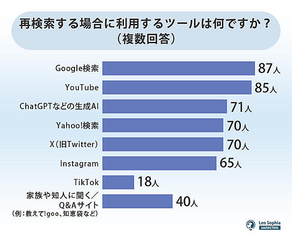 「再検索で使うツール」では、メイン使用されているであろう「Google検索」がやはり強いが、「YouTube」がほぼそれに並ぶ。以下、「ChatGPTなどの生成AI」「Yahoo!検索」「X(旧Twitter)」がそれに続いた。各検索ツールが持つ特性の違いや情報の種類・質、動画かどうかなどが影響すると考えられる。
