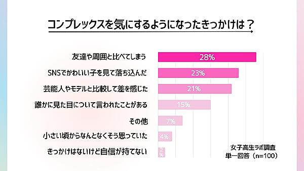 「見た目を気にするようになったきっかけ」については、「友達や周囲と比べてしまう」28%、「SNSでかわいい子を見て落ち込んだ」23%、「芸能人やモデルと比較して差を感じた」21%と、他者との比較などSNSの影響が見てとれる。