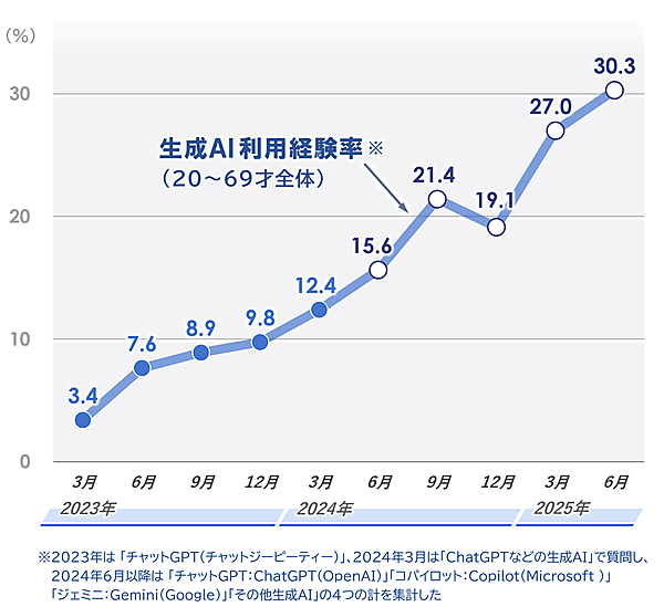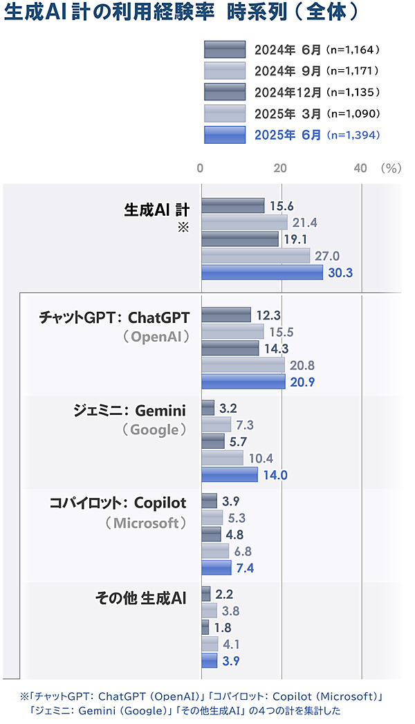 まず、生成AIを使ったことがある人の割合は、2024年6月の15.6%から2025年6月の30.3%へと、1年でほぼ2倍に増加した。