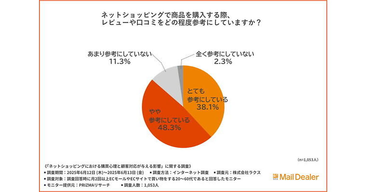 ネットショッピングで商品を購入する際、レビューや口コミを「とても参考にしている」との回答が38.1%、「やや参考にしている」が48.3%と、約9割が他者の評価を購買判断に活用していることがわかった。