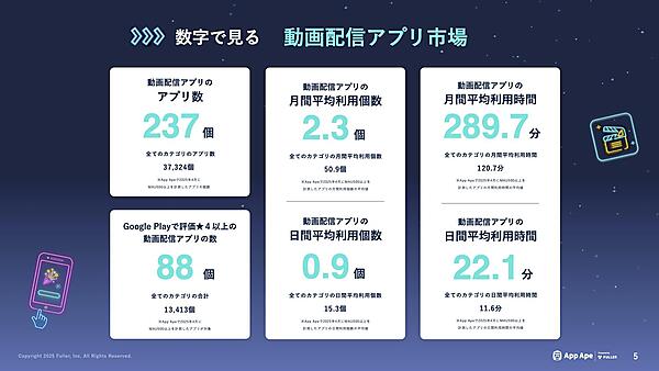 調査によると、2025年4月時点で月間アクティブユーザー数(MAU)500以上を計測した動画配信アプリは237個で、全アプリのうち約0.6%となった。また、MAU500以上のアプリにおける月間平均利用個数は2.3個、月間平均利用時間は289.7分だった。