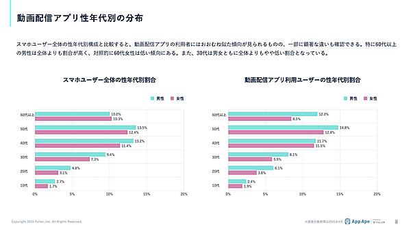 動画配信アプリの利用者を性年代別で見ると、特に50代・60代以上の男性でアプリ利用者の割合が高く、40代・50代女性もやや高い傾向だった。一方で、60代女性・30代男女はスマホユーザー全体よりも低い傾向が見られた。