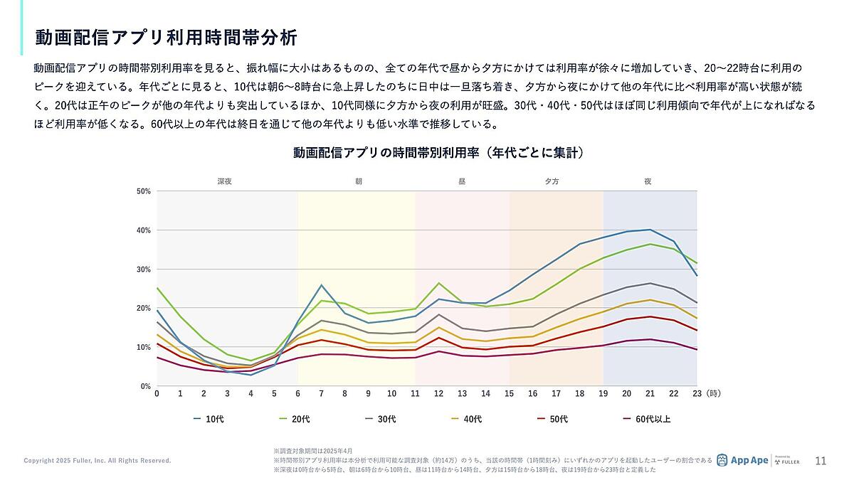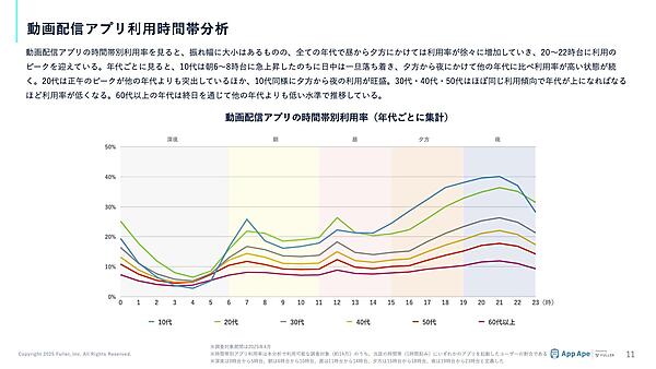 動画配信アプリの利用時間帯を見ると、全世代で20〜22時にピークを迎える傾向があった。年代別で見ると、10代は朝に活発に利用しており、20代は昼・夜の利用が目立った。一方で、60代以上は終日利用率が低い傾向だった。