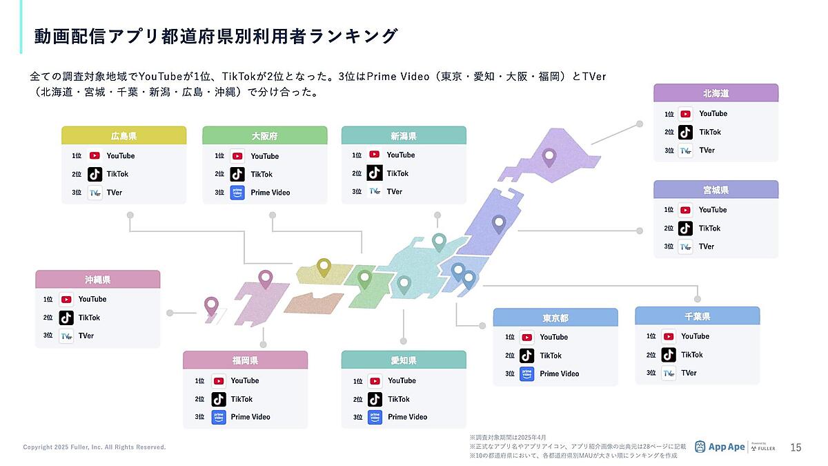 都道府県別の動画配信アプリ利用者ランキングでは、全ての地域で1位が「YouTube」、2位が「TikTok」、3位が「Prime Video」と「TVer」で分け合う形となっており、一部のサービスに人気が集中していることがうかがえた。