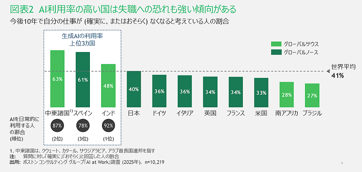 「自動化による雇用への影響に対する懸念」については、「今後10年で自分の仕事がなくなる可能性がある」と41%が回答している。また利用率が上位の国ほど、この傾向は強い。