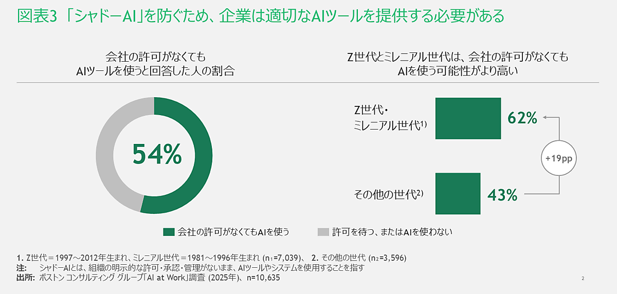 従業員が無断で業務にAIツールを使用する“シャドーAI”は、今後大きな問題を引き起こす可能性があり、実際に「正式に許可されていなくてもAIツールを使う」と54%が回答している。特にZ世代やミレニアル世代にその傾向が強いため、企業側は適切なツール提供を行うことが最重要になるだろう。