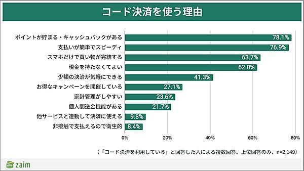 コード決済を選択する理由としては、「ポイント・キャッシュバックがある」が78.1%、「支払いが簡単でスピーディ」が76.9%でツートップに。以下、「スマホだけで買い物が完結する」「現金を持たなくてよい」などに加え、割り勘などに便利な「個人間送金機能」も挙げられた。