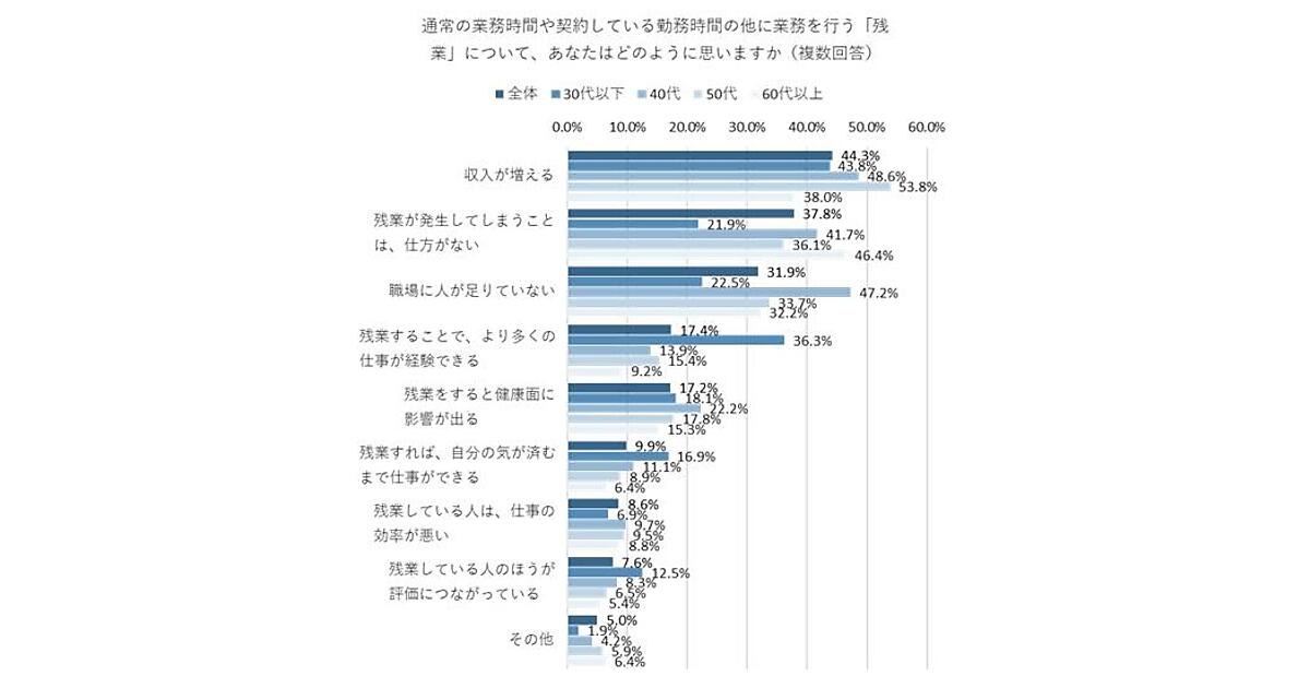 まず「残業に対する印象や考え」を聞くと、全体では「収入が増える」「仕方がない」「職場に人が足りていない」といった意見が上位。これを年代別で見ると「収入が増える」「仕方がない」は年齢層が上がるにつれ増えているが、「職場に人が足りていない」は40代が突出して多かった。また「残業することで、より多くの仕事が経験できる」は30代が突出している。いわゆる現場世代から管理職に移行していることが、考えにも影響したと思われる。なお40代は「残業をすると健康面に影響が出る」という声も多い。