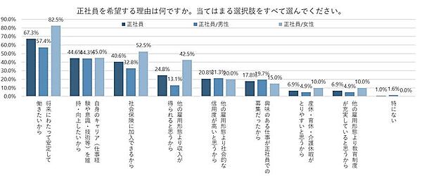 正社員を希望する理由では、「将来にわたって安定して働きたいから」67.3%が最多。以下「自身のキャリア(仕事経験や意識・技術等)を維持・向上したいから」44.6%、「社会保険に加入できるから」40.6%が上位。性別では男性のほうが「興味のある仕事が正社員での募集だったから」が多かった。女性は「他の雇用形態より収入が得られると思うから」「将来にわたって安定して働きたいから」が多かった。