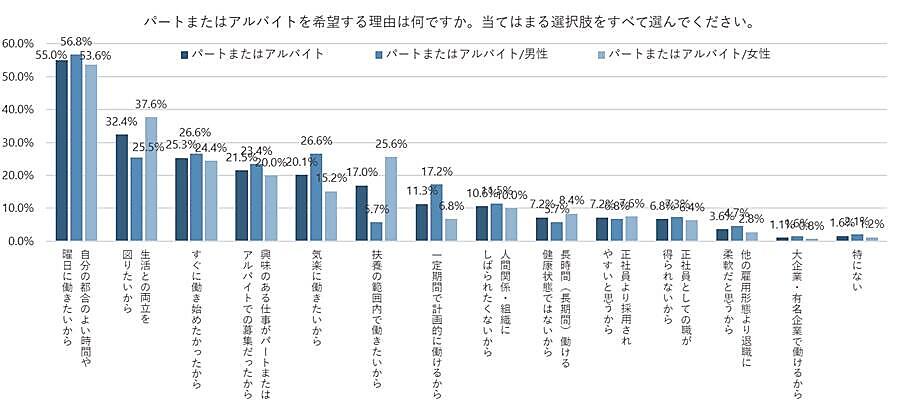 希望職種別に「パート・アルバイトを希望する理由」「正社員を希望する理由」を聞くと、パート・アルバイトを希望する理由では「自分の都合のよい時間や曜日に働きたいから」55.0%が最多。以下「生活との両立を図りたいから」32.4%、「すぐに働き始めたかったから」25.3%が多かった。性別だと男性のほうが「気楽に働きたいから」「一定期間で計画的に働けるから」が多く、女性は「扶養の範囲内で働きたいから」「生活との両立を図りたいから」が多かった。