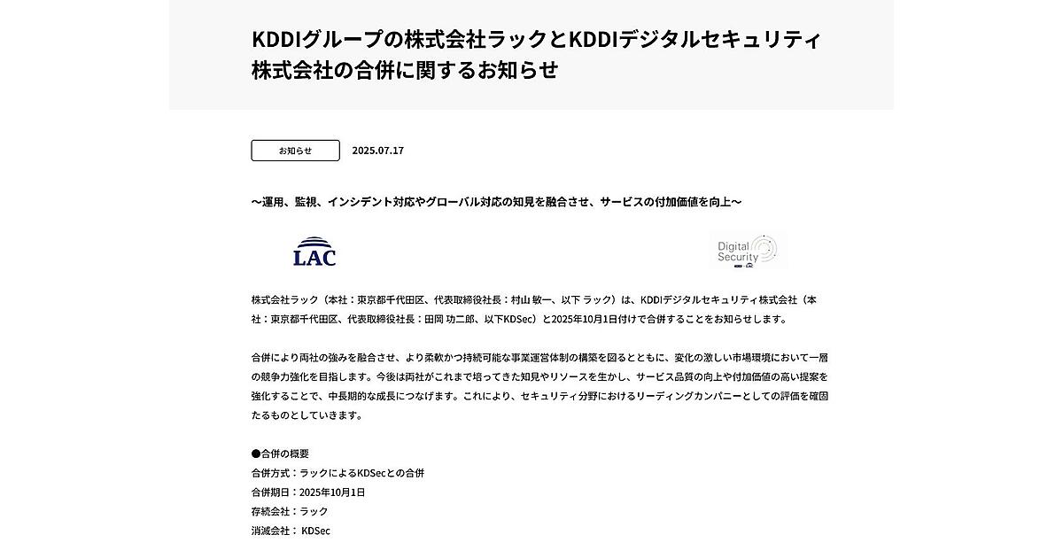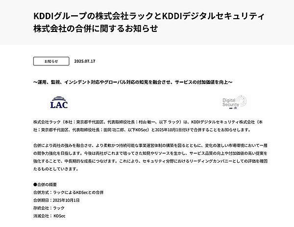 KDDIグループでセキュリティソリューションサービス事業のラックと、同グループでセキュリティ製品・サービス事業のKDDIデジタルセキュリティ(KDSec)は、10月1日付で合併する、と7月17日発表した。ラックが存続会社となる。両社の強みを合わせ、変化が激しい市場環境の中で競争力の一層の強化を目指す。