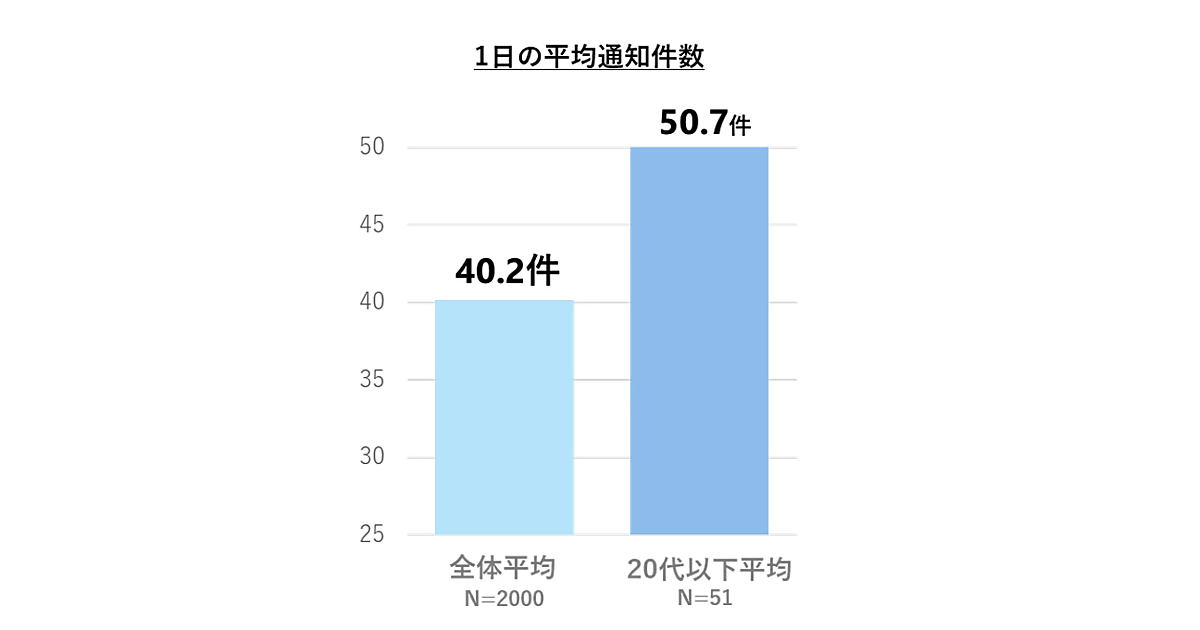 調査によると、1日に届く通知の平均件数は40.2件であり、20代以下では50.7件と平均を大きく上回った。その一方で、全体の58.1%が「通知のうち役に立つものは0%~10%」と回答しており、通知の多くが「不要な情報」であることがわかった。