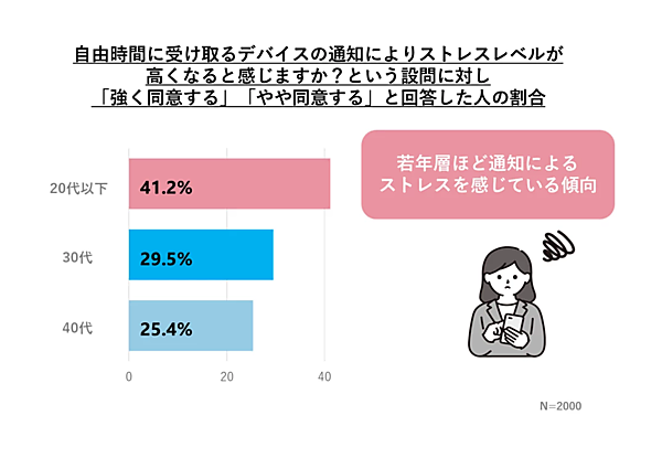 自由時間中に通知を受け取るとストレスレベルが上がるかという質問では、20代以下で41.2%、30代で29.5%、40代で25.4%が「同意する」と回答。若年層ほど通知によるストレスを感じる傾向が強いようだった。