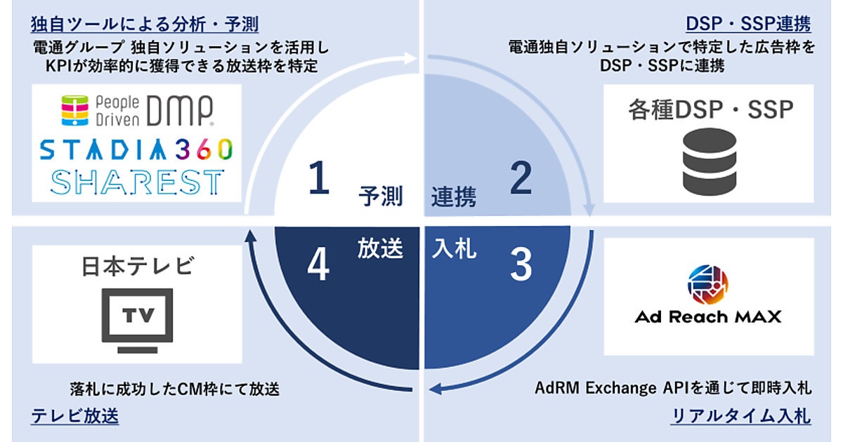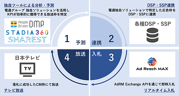 電通は、電通グループ傘下でデジタルマーケティング事業のCARTA ZEROとともに、地上波テレビ広告のリアルタイムな入札買付と運用を可能にするサービスを8月中旬に始める、と7月22日発表した。日本テレビの広告プラットフォーム「Ad Reach MAX(アドリーチマックス)」の取引システム「AdRM Exchange」を通じ、同社の地上波テレビ広告の在庫を取り扱う。
