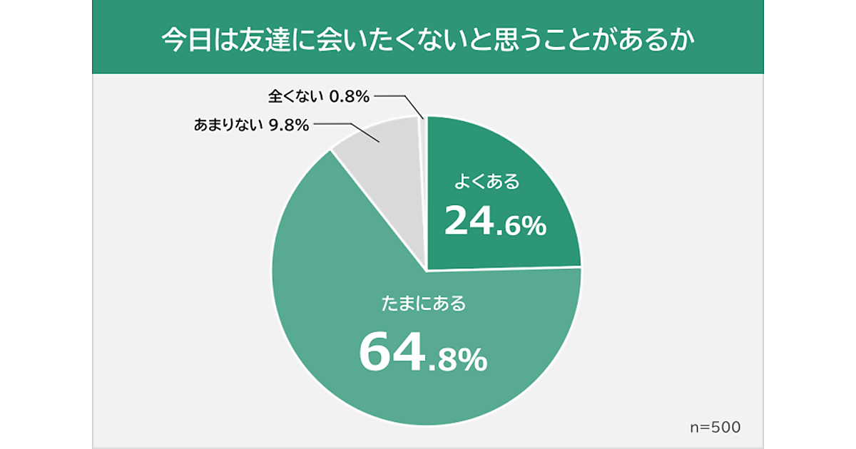 まず社会人の男女500人に「今日は友達に会いたくないと思うことがあるか」を聞くと、「よくある」24.6%、「たまにある」64.8%で、9割近くが経験があった。