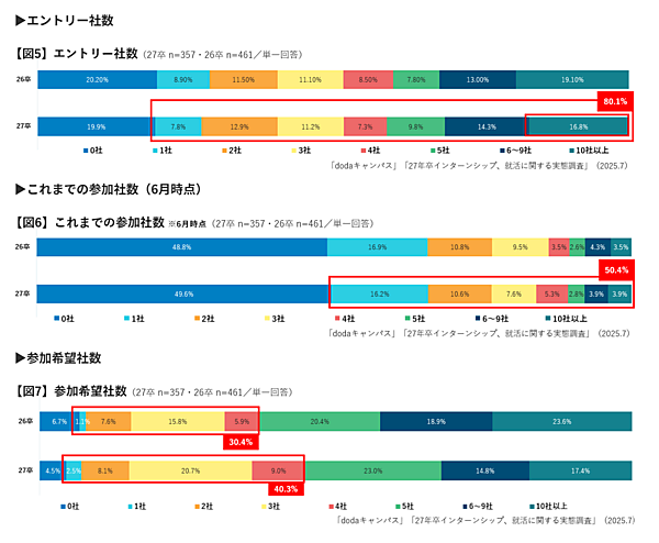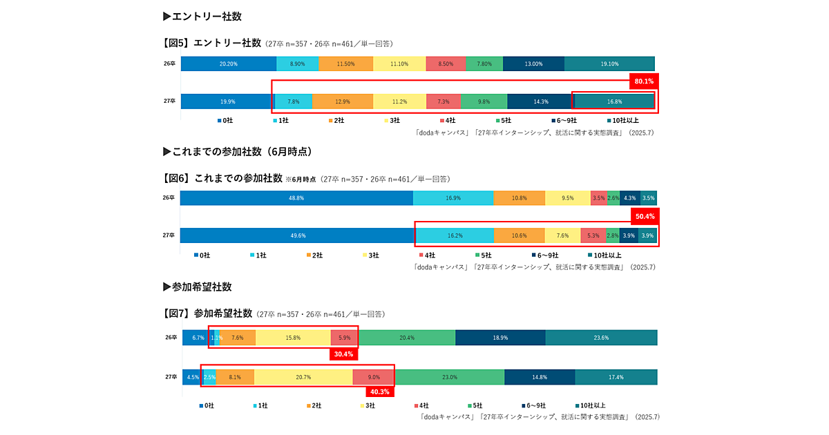 参加を希望する企業数としては、「1社~4社」が合計で40.3%と、26卒比で9.9ポイント増加。多くの企業にエントリーはするものの、参加先は厳選したいという意向がうかがえた。
