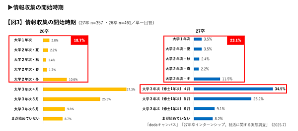 就活の情報収集を始めた時期としては、「大学3年生の4月」が34.5%で最多に。一方で、「大学1~2年まで」に始めた学生は合計で23.1%と、26卒と比べて4.4ポイント増加。低学年のうちから就活に意識を向ける学生が増えていることがうかがえた。