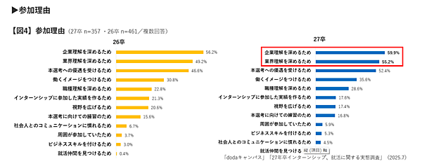 インターンシップの参加理由を聞くと、「企業理解を深めるため」が59.9%、「業界理解を深めるため」が55.2%、「本選考への優遇を受けるため」が52.4%となった。26卒と比較して順位に変動はなく、業界・企業研究が引き続き重視されているようだ。