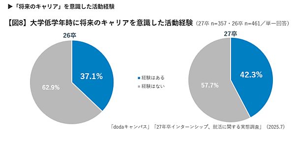 大学1・2年生時に「将来のキャリアを意識した活動」をした経験があるかという質問では、「経験あり」が42.3%となり、26卒比で5.2ポイント増加。理由としては、「働くイメージを持つのに役立つと思ったから」、「やりたい仕事について考えたかったから」など、仕事への前向きな意見が多く見られた。