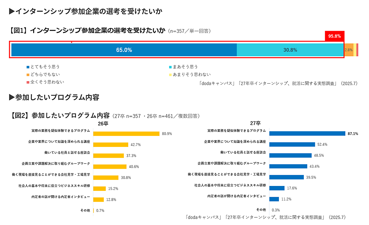 まず、インターンシップ参加企業の選考を受けたいかどうかを聞くと、「受けたい」は合計で95.8%にのぼった。参加したいプログラム内容としては、「実際の業務を疑似体験できる」が30ポイント以上の差をつけて1位に。26卒との比較でも6.2ポイントの増加が見られた。