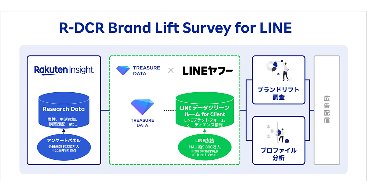 楽天グループ傘下でマーケティングリサーチ事業の楽天インサイトは、同社の調査データと、LINEヤフーのコミュニケーションアプリ「LINE」のデータクリーンルーム(DCR)を連携させた分析プロダクト「R-DCR Brand Lift Survey for LINE」の本格提供を7月24日に始めた、と同日発表した。運用型広告配信プラットフォーム「LINE広告」を対象に顧客分析・広告効果測定を行う。