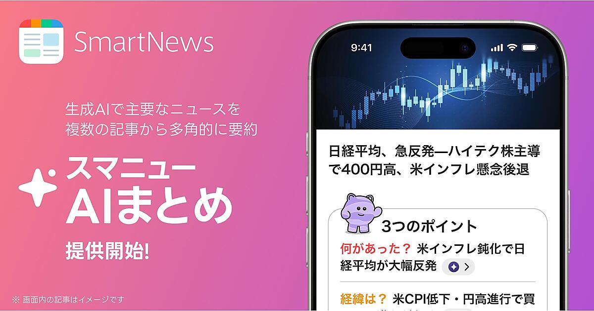 ニュースアプリ運営事業のスマートニュースは、同社が展開する同アプリ「SmartNews」で、主要なニュースを複数の記事から個別に要約する機能「スマニューAIまとめ」の提供を7月24日に始めた、と同日発表した。全国紙や民放キー局が伝える同じテーマの主要ニュースを生成AI(人工知能)が要約し、複数の要約を1つの記事にまとめる。